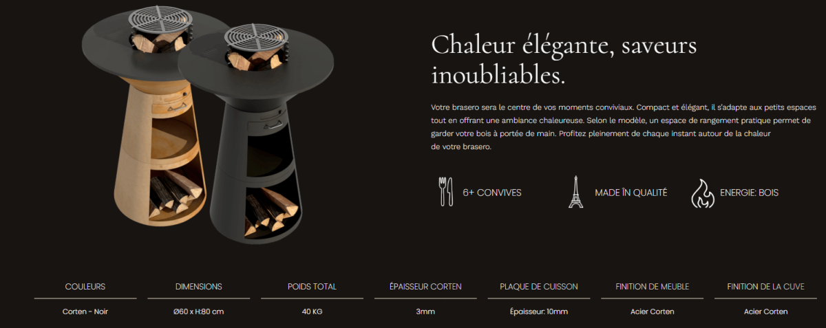 Brasero LABREZZ Ø60 cm en acier corten, compact, élégant et idéal pour créer une ambiance chaleureuse dans les petits espaces. Il dispose d’un meuble de rangement intégré pour le bois et d’une plaque de cuisson épaisse pour des cuissons conviviales. Facile à entretenir et pensé pour accueillir 6 convives ou plus, il est 100 % Made in France et fonctionne au bois. Parfait pour les moments de partage en extérieur !