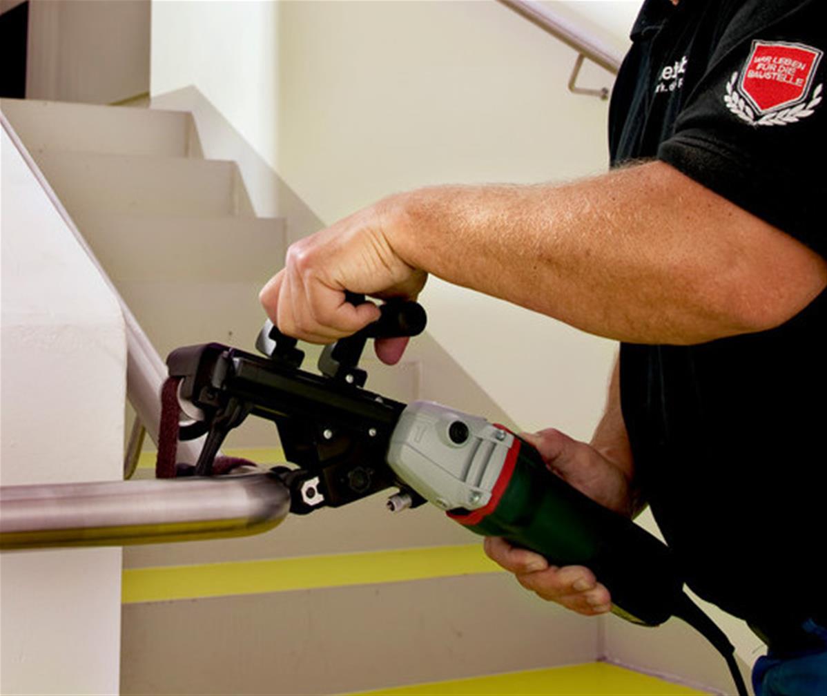Adaptateur de ponçage compact réglable sans outil ; parfait pour travailler sur des mains courantes montées Changement de bande abrasive sans outil et guidage de bande réglable