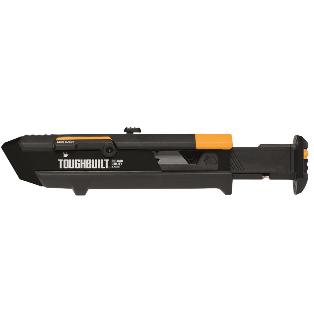 Cutter TOUGHBUILT TB-H4S2-03 avec mécanisme breveté de rechargement rapide, 2 chargeurs à lames interchangeables, poignée antidérapante ergonomique et lames droites + crochues incluses.