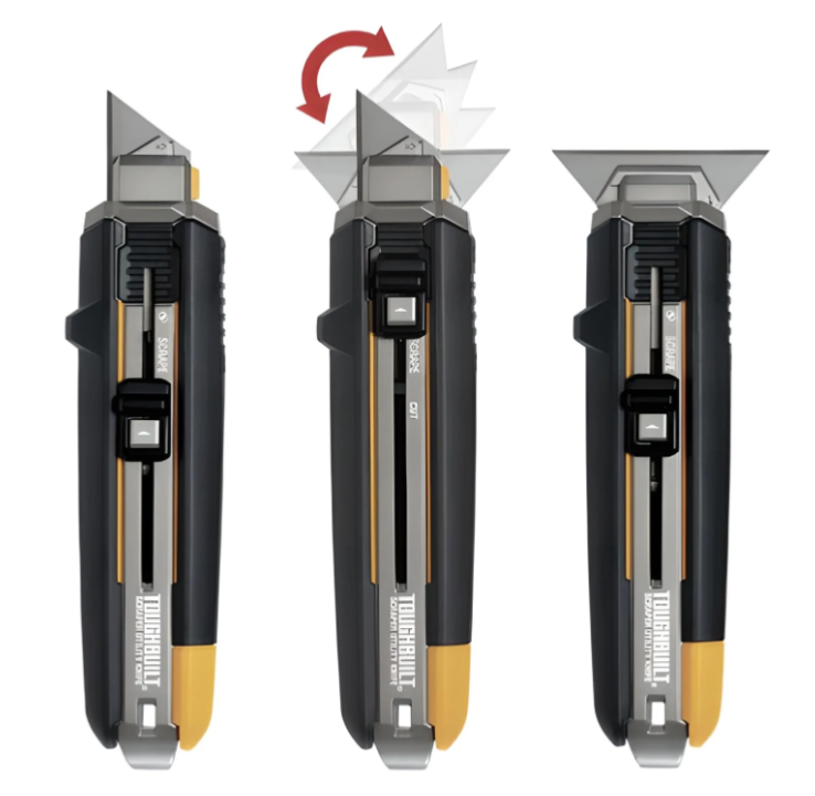 Cutter grattoir TOUGHBUILT TB-H4S5-01 avec mécanisme 2-en-1 breveté, poignée ergonomique antidérapante et 5 lames universelles incluses pour couper ou gratter avec précision.