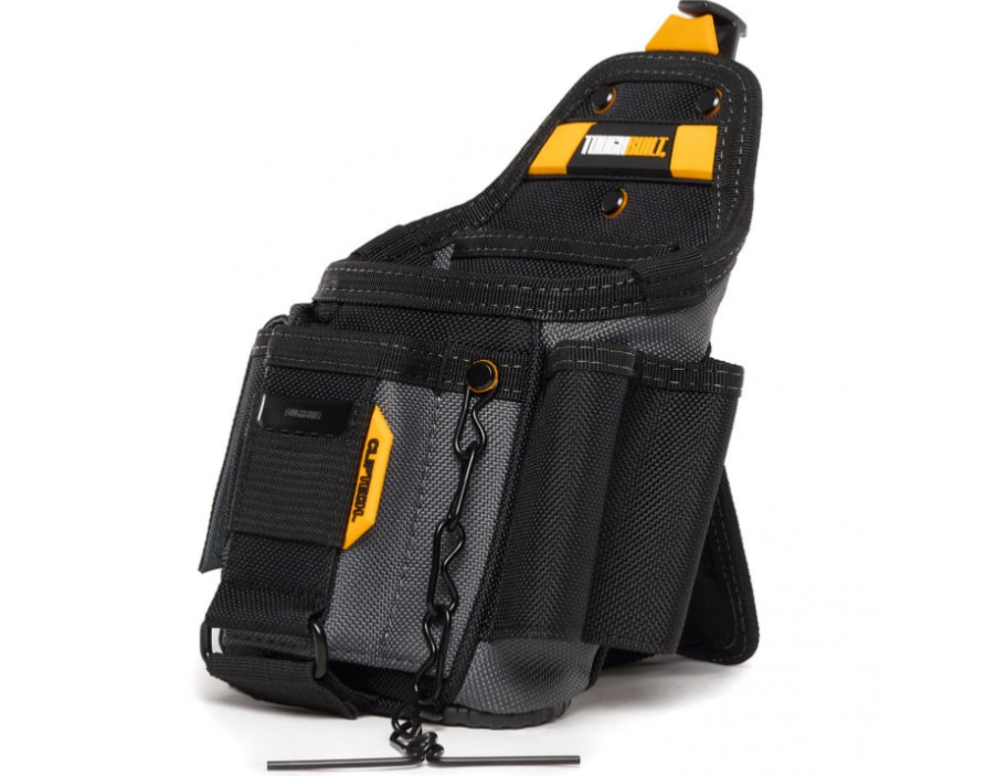 Pochette électricien TOUGHBUILT TB-CT-34 petit format avec système ClipTech™, volet de protection, 13 poches et passants, dont testeur, smartphone, chaîne ruban. Compacte, robuste et stable.