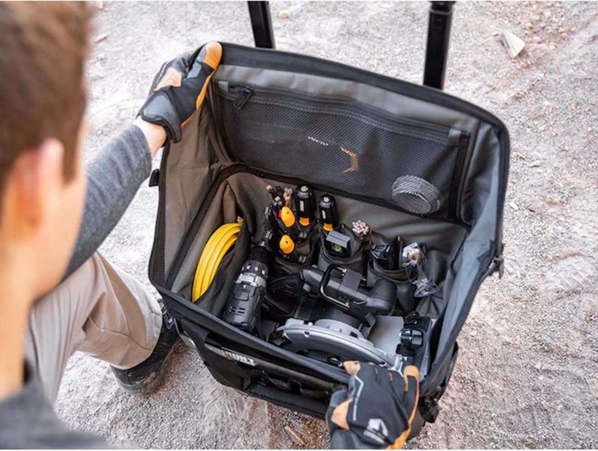 Sac à outils XXL TOUGHBUILT TB-CT-61-22 avec ouverture massive brevetée 38 cm, volume 115 L, base rigide étanche et roues tout-terrain pour une organisation professionnelle ultra-robuste.